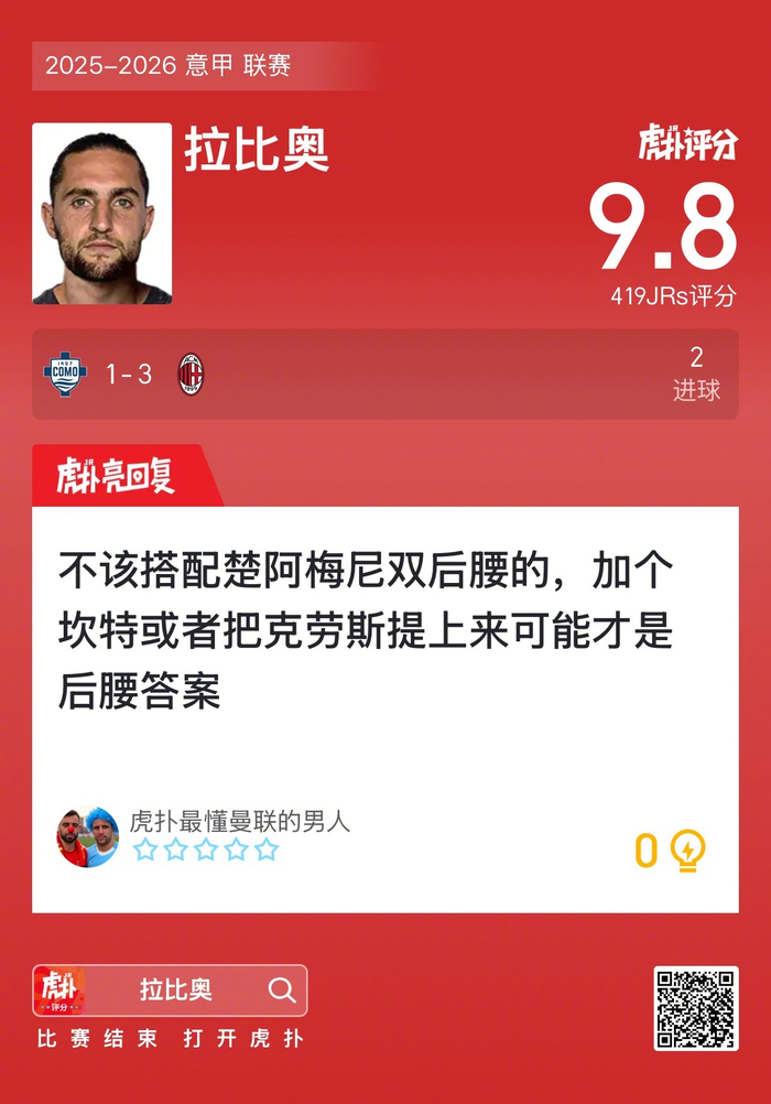 #科莫1比3ac米兰# 拉比奥打进两球,这表现你给几分?